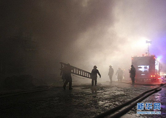 More than 30 fire trucks and nearly a hundred fire fighters rush to a construction material market in Changchun, northeast China's Jilin Province, at around 23:00, December 15, 2011. The fire burned an area of about 1,000 square meters. No casualties were reported. [Xinhua Photo]