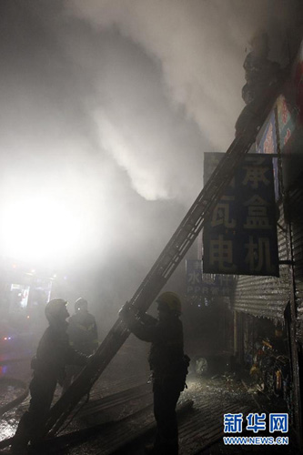 More than 30 fire trucks and nearly a hundred fire fighters rush to a construction material market in Changchun, northeast China's Jilin Province, at around 23:00, December 15, 2011. The fire burned an area of about 1,000 square meters. No casualties were reported. [Xinhua Photo]
