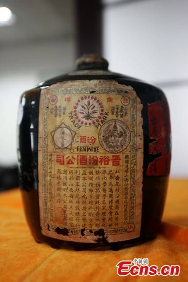 A bottle of Fenjiu, a kind of Chinese distilled alcoholic beverage produced in the 1920s and 30s, fetches up to 790,000 yuan ($125,000) at auction of a selected collection of fine liquors in Taiyuan, capital of north China's Shanxi Province, December 18, 2011. [CNS Photo/Zhang Yun]