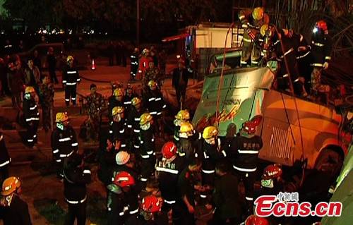 A collapsed scaffold at a construction site of light rail line in southwestern China's Chongqing Municipality hit a passing bus, leaving one dead and six injured, December 19, 2011. [CNS Photo/Lian Xiao]