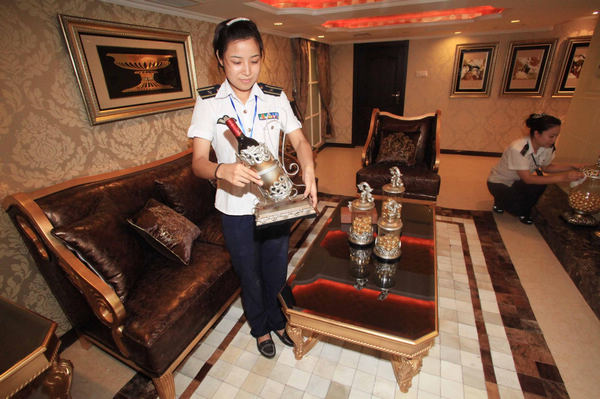 Two attendants clean the Presidential suite of the Tianjin Aircraft Carrier Hotel in Tianjing on August 8, 2011. [Photo/Xinhua]