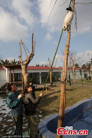 Panda Qingfeng chases a stray cat up a tree at the Nanshan Zoo in Yantai, east China's Shandong Province, December 26, 2011. The cat, after being stuck there for more than two hours, was rescued by zoo workers. [CFP Photo]