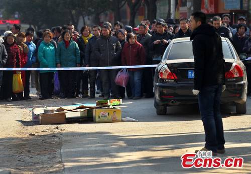 An investigators surveys the scene of a robbery and murder occurred close to a bank in Nanjing, capital of east China's Jiangsu Province, January 6, 2012. The blood of the victim at the crime site is covered by cardboards. Police set to track down the suspect throughout the city. [CNS Photo/Yang Bo]