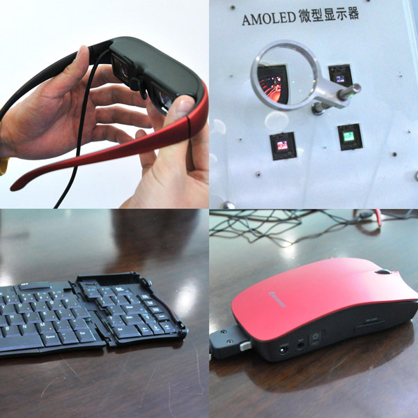 Photo taken on Jan 6, 2012 shows the folding keyboard, the mainframe, the micro-monitors and the mouse of a wearable computer designed by a company in Southwest China's Yunnan province. The wearable computer, designed and made by a sci-tech company in Yunnan, includes an eyeglasses-shaped mainframe, a mouse and a folding keyboard. The computer, the first of its kind in China, will be mass-produced and sold in March. [Photo/Xinhua]
