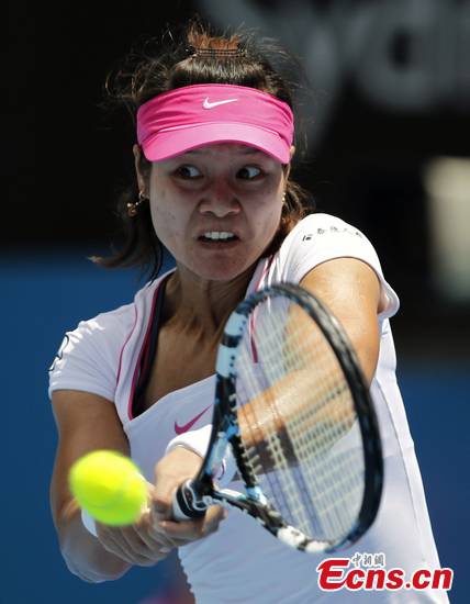 China's Li Na plays a forehand shot in her first round march against Ekaterina Makarova of Russia at the Sydney International tennis tournament in Australia, Monday, January 09, 2012. Defending champion Li Na has made a sizzling start, romping into the second round in 66 minutes. [Photo:Agencies]