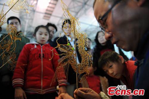 Sugar-coated dragon figurine, a kind of handmade Chinese folk candy, attracts a crowd on a street selling special purchases for the Spring Festival in Kunming, southwest China's Yunnan Province, January 9, 2012. [CNS Photo/Ren Dong]