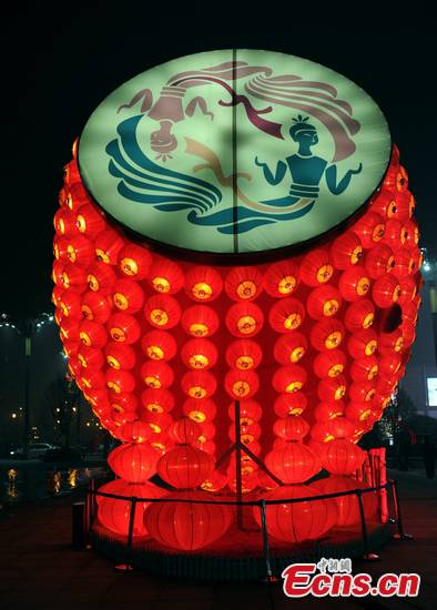 A 2-ton waist–drum light display formed by 496 lanterns, stands 9 meters tall on the Kaiyuan Square in Xi'an, capital of northwest China's Shaanxi Province, January 10, 2012. [CNS Photo/Zhang Yuan]