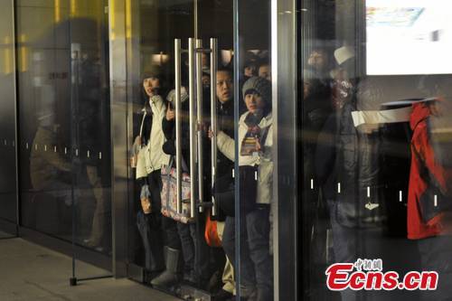 Hundreds of Scalpers queue overnight outside an Apple store in downtown Beijing to be among the first in China to get the new iPhone4S, January 12, 2012. [CNS Photo]