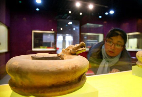 A visitor watches a pottery with dragon decoration of the Eastern Jin Dynasty (317-420) in Nanjing, capital of east China's Jiangsu Province, January 25, 2012. To celebrate Chinese Lunar New Year of the Dragon, Nanjing Museum held exhibitions with the theme of dragon during the Spring Festival holiday. [Photo: Xinhua/Wang Xin]