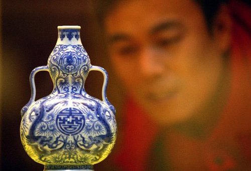 A visitor watches a porcelain bottle with dragon decoration of the Qing Dynasty (1644-1911) in Nanjing, capital of east China's Jiangsu Province, January 25, 2012. To celebrate Chinese Lunar New Year of the Dragon, Nanjing Museum held exhibitions with the theme of dragon during the Spring Festival holiday. [Photo: Xinhua/Wang Xin]