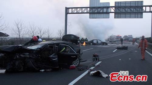 Firefighters battle a cars crash fire at Xinpu section of the Shenhai Express in Cixi, east China's Zhejiang Province, on early Tuesday morning, January 31, 2012. The fatal accident involving 4 cars killed 4 people. [CNS Photo/He Jiangyong]