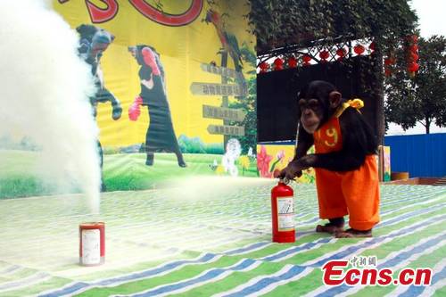 Animal stars of a safari park conduct a special fire drill in southwestern China's Chongqing Municipality, January 31, 2012. [ICpress]