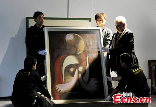 Chengdu customs officers inspect a piece of painting by Spanish artist Pablo Picasso, February 6, 2012. A total of 56 art works by Pablo Picasso, valued at 670 million Euros, were shipped from Shanghai to Chengdu, the second stop of Picasso 2012 China Exhibition. [CNS Photo/An Yuan]