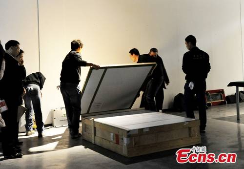 Chengdu customs officers inspect a piece of painting by Spanish artist Pablo Picasso, February 6, 2012. A total of 56 art works by Pablo Picasso, valued at 670 million Euros, were shipped from Shanghai to Chengdu, the second stop of Picasso 2012 China Exhibition. [CNS Photo/An Yuan]