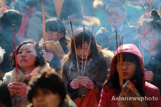 People hold burning incense and pray for good fortune on the morning of the Lantern Festival, the last day of Chinese Lunar New Year celebrations at Yonghegong Lama Temple in Beijing, Feb 6, 2012. [Photo/Asianewsphoto]