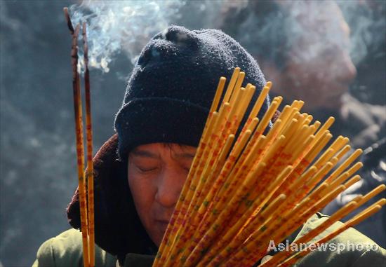A man holds burning incense and prays for good fortune at Yonghegong Lama Temple, Feb 6, 2012. [Photo/Asianewsphoto]
