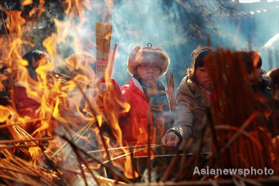 People burn incense to pray for good fortune on the Lantern Festival, the last day of Chinese Lunar New Year celebrations at Yonghegong Lama Temple, Feb 6, 2012. [Photo/Asianewsphoto]