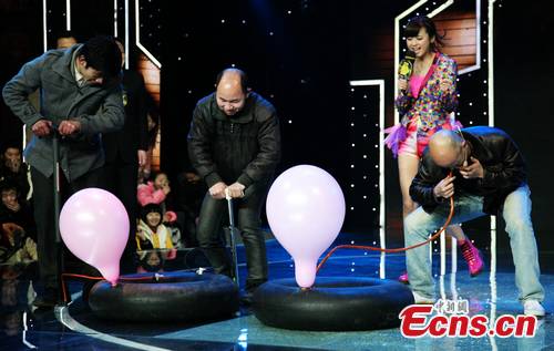 Liu Fei, from Jiangxi Province, blows into tires with his nose to challenge two participants using pumps at a TV talent show in Changsha, Hunan Province. [CNS Photo/Yang Huafeng]