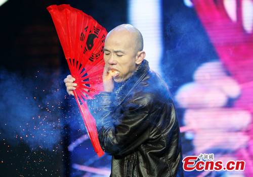 Liu Fei, from Jiangxi Province, shows his strange ability to turn a mouthful of sawdust into open flame in two minutes. [CNS Photo/Yang Huafeng]