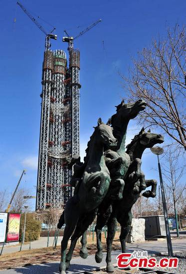 A several-hundred-meter-tall steel tower is built up in the north of the Olympic Park as a new landmark of Beijing, February 16, 2012. [CNS Photo/Zou Xian]