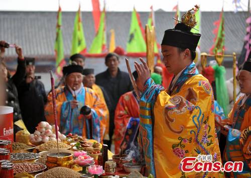 Fully dressed Taoist priests mark the 2583rd birthday of Laotzu, founder of Taoism, on the 15th day of the second month of the Chinese calendar, which falls on March 7 this year, in Luyi County, central China's Henan Province. [CNS Photo/Hu Ying]