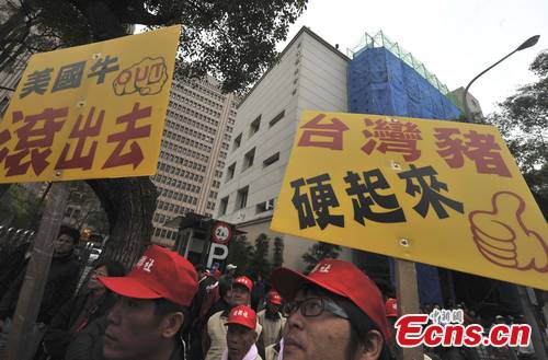 People hold up banners to protest against beef imports from the United States in Taipei, March 8, 2012. [CNS Photo/Jia Guorong]