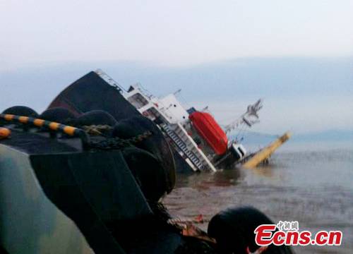 A cargo ship with 40 sailors on board including 20 Chinese sinks off Zhoushan, east China's Zhejiang Province, as the Panama-flagged vessel YUAN TONG leaves from a dockyard for berth, March 13, 2012, around 6:40 a.m.. One is dead, and seven are missing in the accident. 32 crew members have been rescued. Search and rescue operation continue. The cause is still under investigation. [CNS Photo]