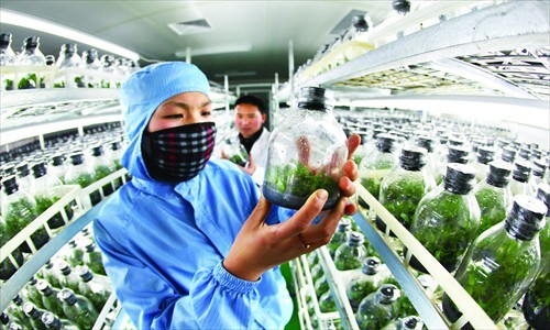A floriculturist holds a bottle of an orchid seedling in Ganyu county, Jiangsu Province Monday. Orchid cultivation is on the rise in China. The Haikou government in Hainan Province Monday annnounced a 500 million yuan ($79 million) plan to build the world's largest orchid plantation by 2015. Photo: IC