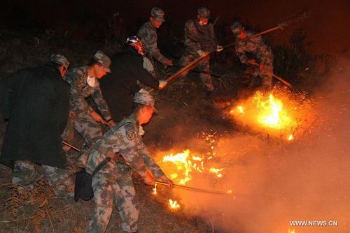 Firefighters battle flames in a forest in Jinning County, southwest China's Yunnan Province, March 31, 2012. A forest fire broke out on Wednesday in the Qingshuihe Village in Jinning County. After rescue efforts of some 2,000 firemen, the fire has been brought under control. (Xinhua/Xiong Zijun)