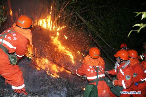Firefighters try to extinguish forest fire on the Jinyun Mountain in Chongqing Municipality, southwest China, April 3, 2012. The forest fire on the Jinyun Mountain broke out on Monday and fast covered more than 10 kilometers. The fire was taken under control at noon Tuesday. (Xinhua/Zhang Chunhua)