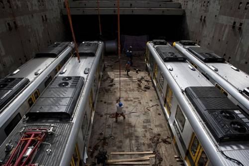Workers load a subway train carriage at a port in Buenos Aires, April 12, 2012. [Photo/Xinhua]