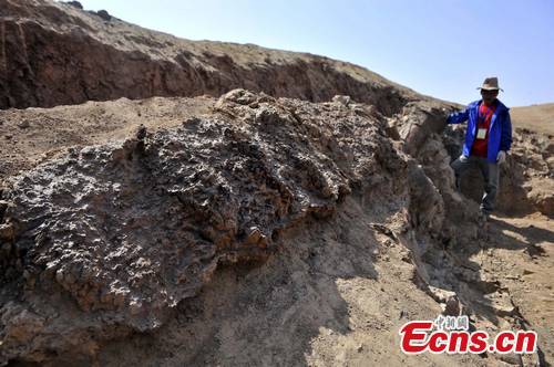 The largest Jurassic dinosaur fossil in the nation is discovered by Chinese scientific researchers in Shanshan County, Turfan region in northwest China's Xinjiang Uygur Autonomous Region, April 15, 2012. [CNS Photo/Liu Xin]