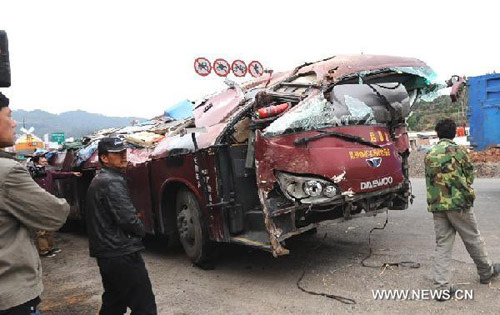 Photo taken on April 26, 2012 shows the destroyed bus at Chuxiong Yi autonomous prefecture, southwest China's Yunnan Province. Nine people were killed and 36 others injured, including eight seriously, after a coach veered off an expressway section here late Wednesday night. The 44-seat sleeper coach had 46 people on board including two drivers,when the accident happened in Nanhua County, Chuxiong Prefecture, at around 11:30 p.m. Wednesday. (Xinhua/Chen Haining)