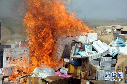 A pile of confiscated chromium-tainted medicine capsules are set on fire at a refuse dump in Urumqi, Xinjiang Uygur autonomous region, April 27. More than 50,000 boxes of capsules were burned on the day. [Photo/Xinhua]