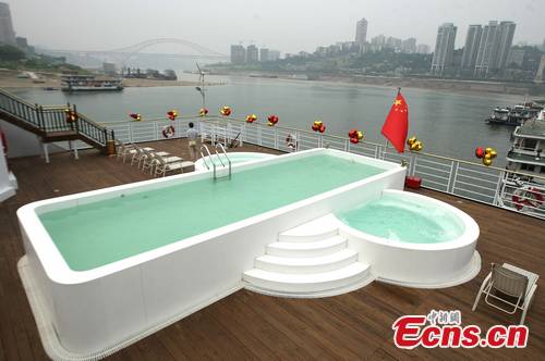 The Yangtze Gold Cruise Ⅲ, the world's largest luxury cruise ship sailing in China's inland rivers, is launched out on its maiden voyage on May 6, 2012. [CNS Photo/Han Lu]