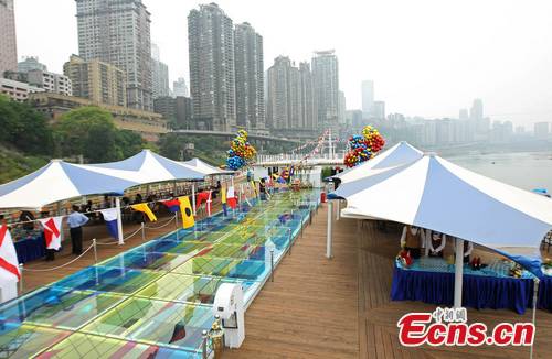 The Yangtze Gold Cruise Ⅲ, the world's largest luxury cruise ship sailing in China's inland rivers, is launched out on its maiden voyage on May 6, 2012. [CNS Photo/Han Lu]