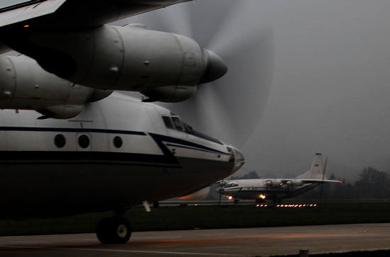 Military transport aircraft prepare to take off during a night flying training Chengdu, Sichuan province, May 5, 2012. [Photo/Xinhua]