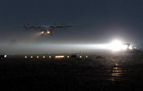 A military transport aircraft lands at airport after finishing a night flying training Chengdu, Sichuan province, May 5, 2012. [Photo/Xinhua]