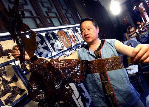 Shadow puppetry performer Zhou Wei prepares the shadow puppet for the upcoming performance, Shanghai, May 14, 2012. Shadow puppetry is a kind of traditional Chinese performing art which uses flat articulated figures (shadow puppets) to create the impression of moving humans and other three-dimensional objects. Although popular in ancient times, this kind of traditional art has witnessed decline in recent years. Zhou Wei has been working as a shadow puppet performer for decades and hopes to transmit the culture heritage to the next generation. [Photo/Xinhua]