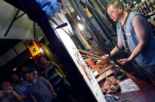 Zhou Wei performs shadow puppetry for tourists. Shanghai, May 14, 2012.[Photo/Xinhua]