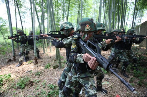 Paramilitary policemen search for "terrorists" in the jungle during an anti-terror drill in Anhui Province, May 21, 2012. Anti-terror unit of the People's Armed Police (PAP)'s Xuancheng branch launched an anti-terror drill in the mountain areas of Anhui on Monday to improve its emergence response ability. [Photo: Xinhua]