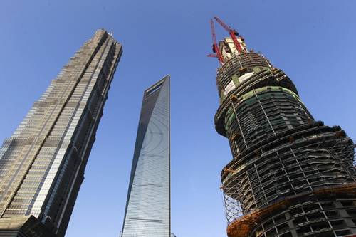 The Shanghai Tower, designed to be 632 meters in height, reaches 300 meters during construction in the Pudong district of the city, May 28, 2012. [Photo/Xinhua]