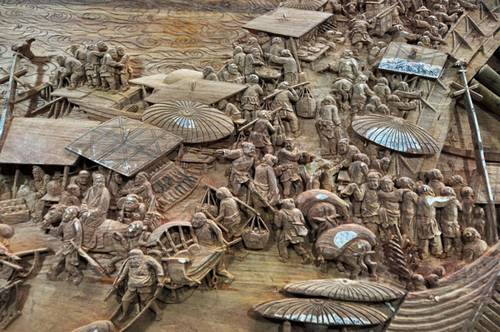 A part of the mahogany carving of the Riverside Scene at Qingming Festival is shown in Zouping County, East China's Shandong province, June 27, 2012. [Photo/Asianewsphoto]