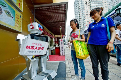 Passers-by look at the robot outside a "robot restaurant" in Harbin, Heilongjiang province, June 28, 2012. There are 18 robot waiters and chefs in this restaurant. All of them are designed and built by engineer Liu Hasheng and his team. Liu said he is working two kinds of robots: one could clean outside windows of skyscrapers and the other could help elder people. [Photo/Xinhua]