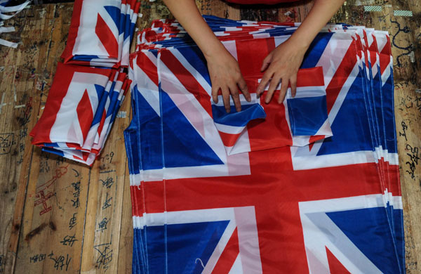 Worker packs flags in King Industrial workshop in Wuyi county, East China's Zhejiang province, July 12, 2012.[Photo/Xinhua]