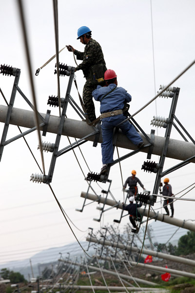Cable workers make an urgent repair on transmission lines damaged by heavy rain and strong wind brought by Typhoon Haikui on a provincial highway of Songmen Twonship in Wenling City, east China's Zhejiang Province, Aug. 8, 2012. (Xinhua/Sun Jinbiao)