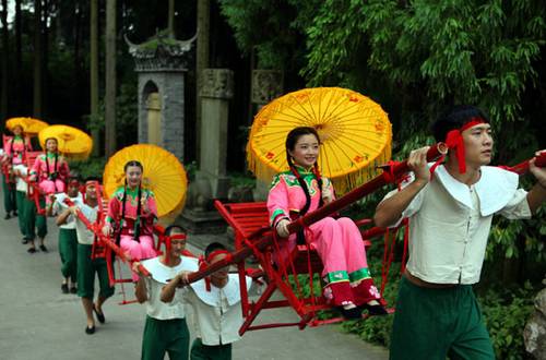 University students who returned home for their summer vacation carry women on wooden thrones at the Huaying Mountain scenic spot in Sichuan province on Aug 12, 2012. The students put on the historic show, which is listed on the provincial intangible cultural heritage list, as a way to showcase their heritage. [Photo/Asianewsphoto]