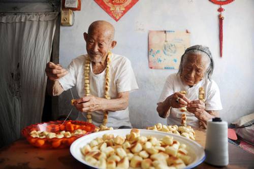 Gong Deyun, 99, threads mianguo, a local snack food, with his wife, Sun Yucui, 102, to celebrate Qixi Festival at their home in East China's Shandong province, Aug 21, 2012. The couple got married in 1930 and had six children. Qixi, or the seventh day of the seventh lunar month, is now referred to as Chinese Valentine's Day. [Photo/Xinhua]