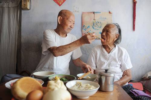 Gong Deyun serves a dish to his wife, 102-year-old Sun Yucui, at home, Aug 21, 2012. [Photo/Xinhua]