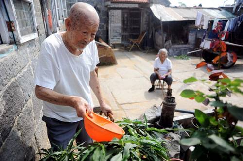 Gong Deyun waters plants at home as his wife, Sun Yucui, looks on, Aug 21, 2012. [Photo/Xinhua]